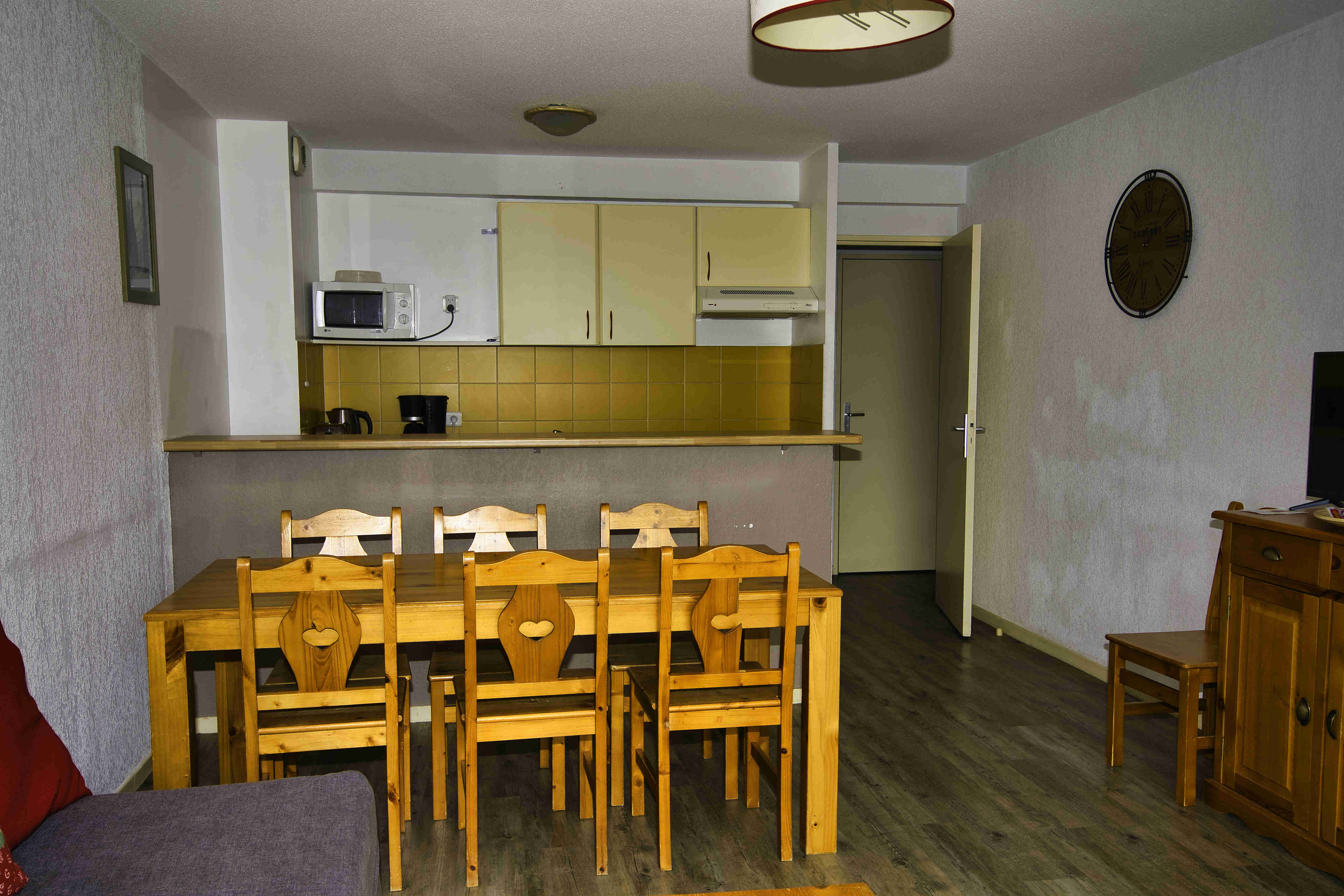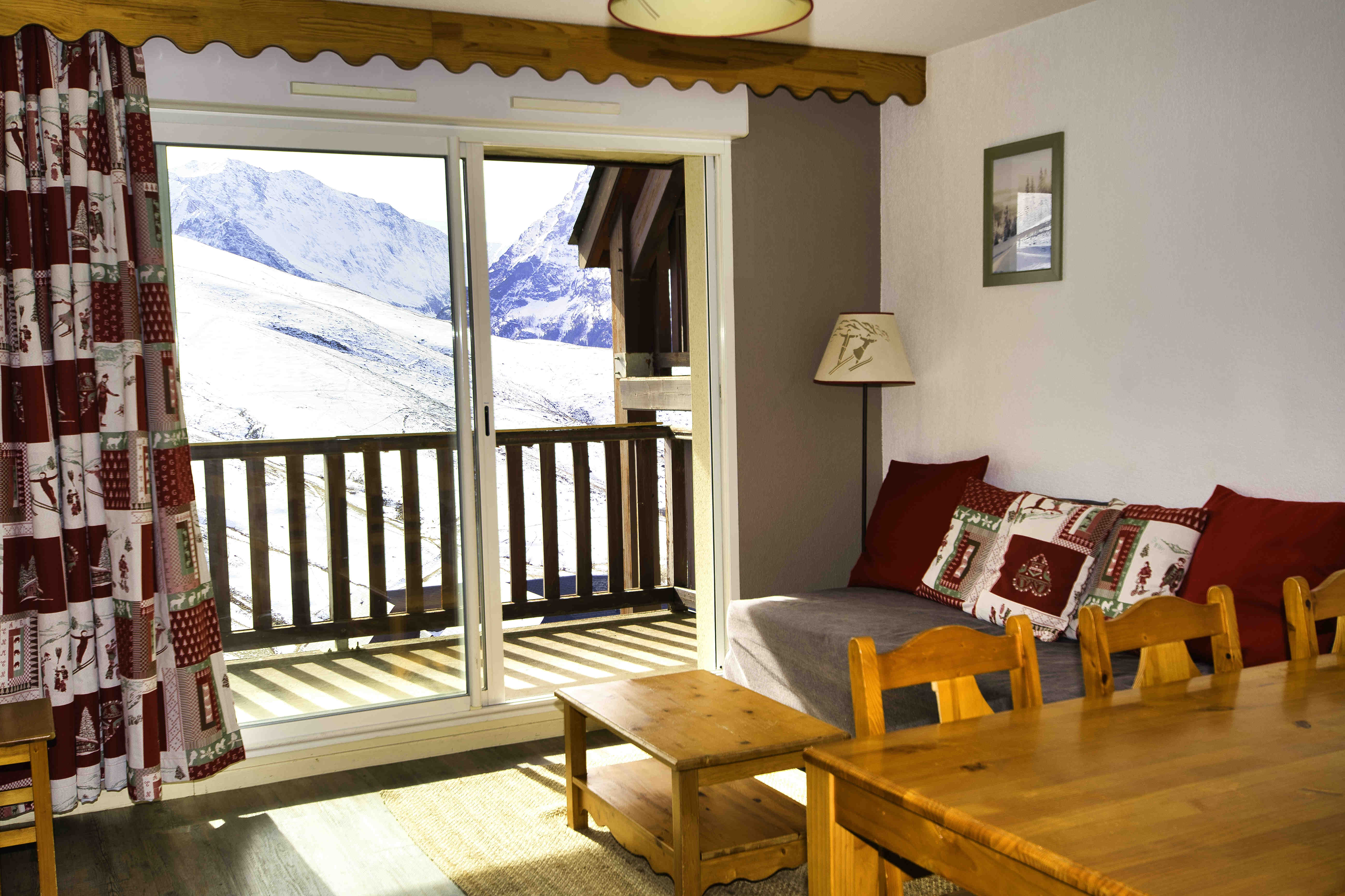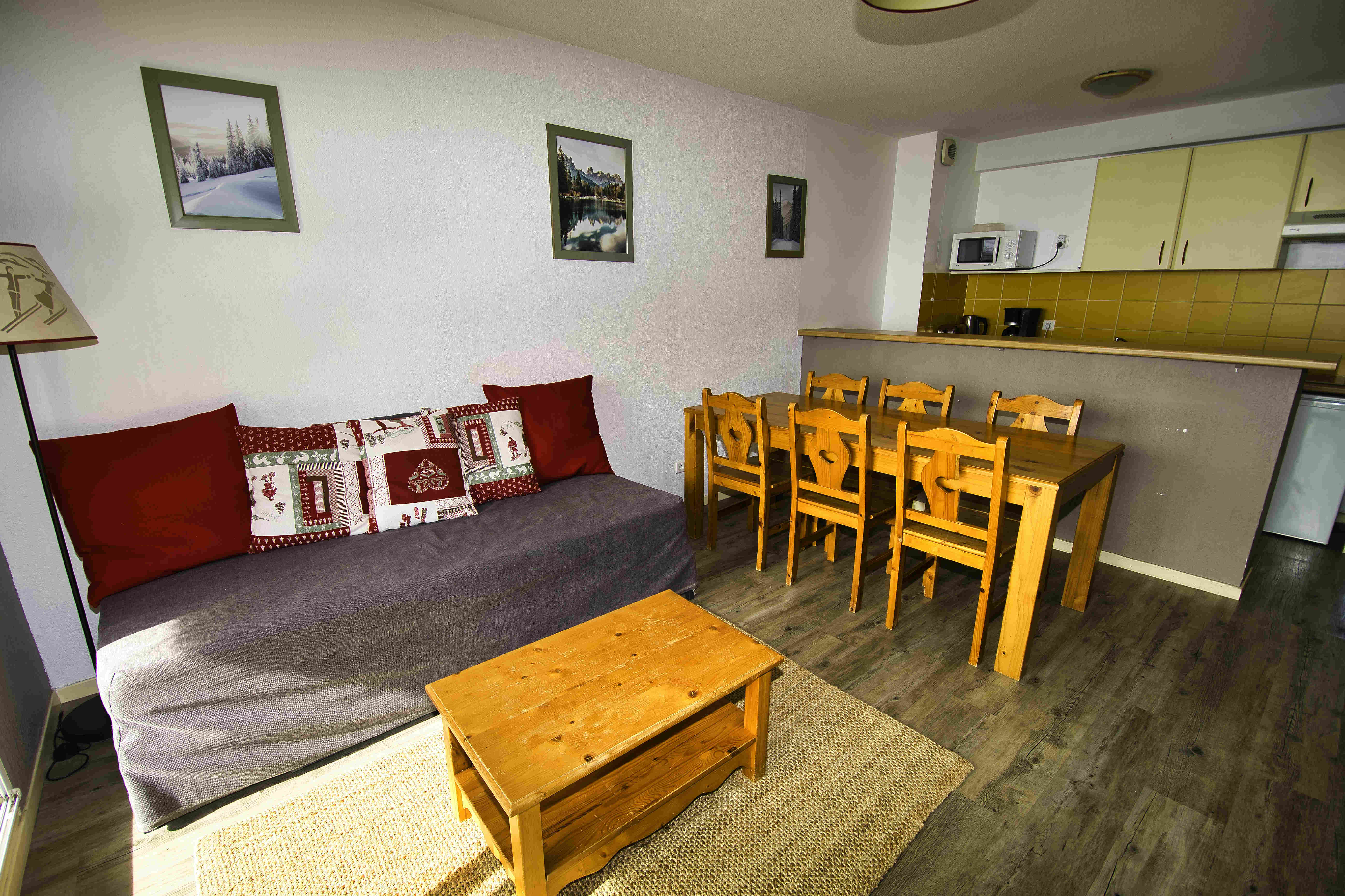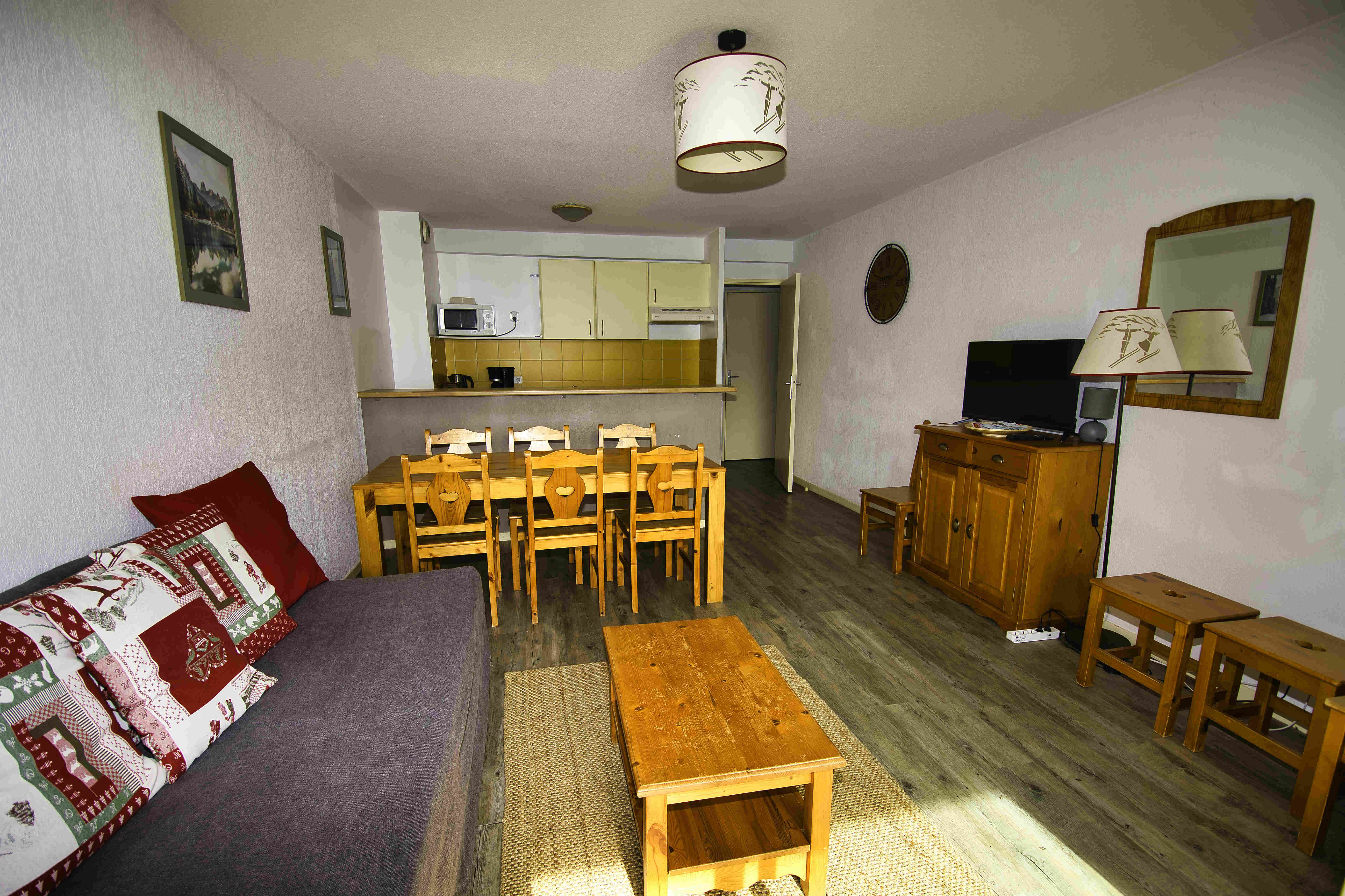 • Séjour de 17,28 m² équipé d’une table et de 8 chaises, d’un canapé gigogne offrant soit deux couchages de 90 x 190, soit un couchage de 180 x 190 en jumelant les deux couchages, d’une table basse, d’un téléviseur, avec balcon de 7,70 m² orienté sud-sud-est vue sur la montagne et la vallée,