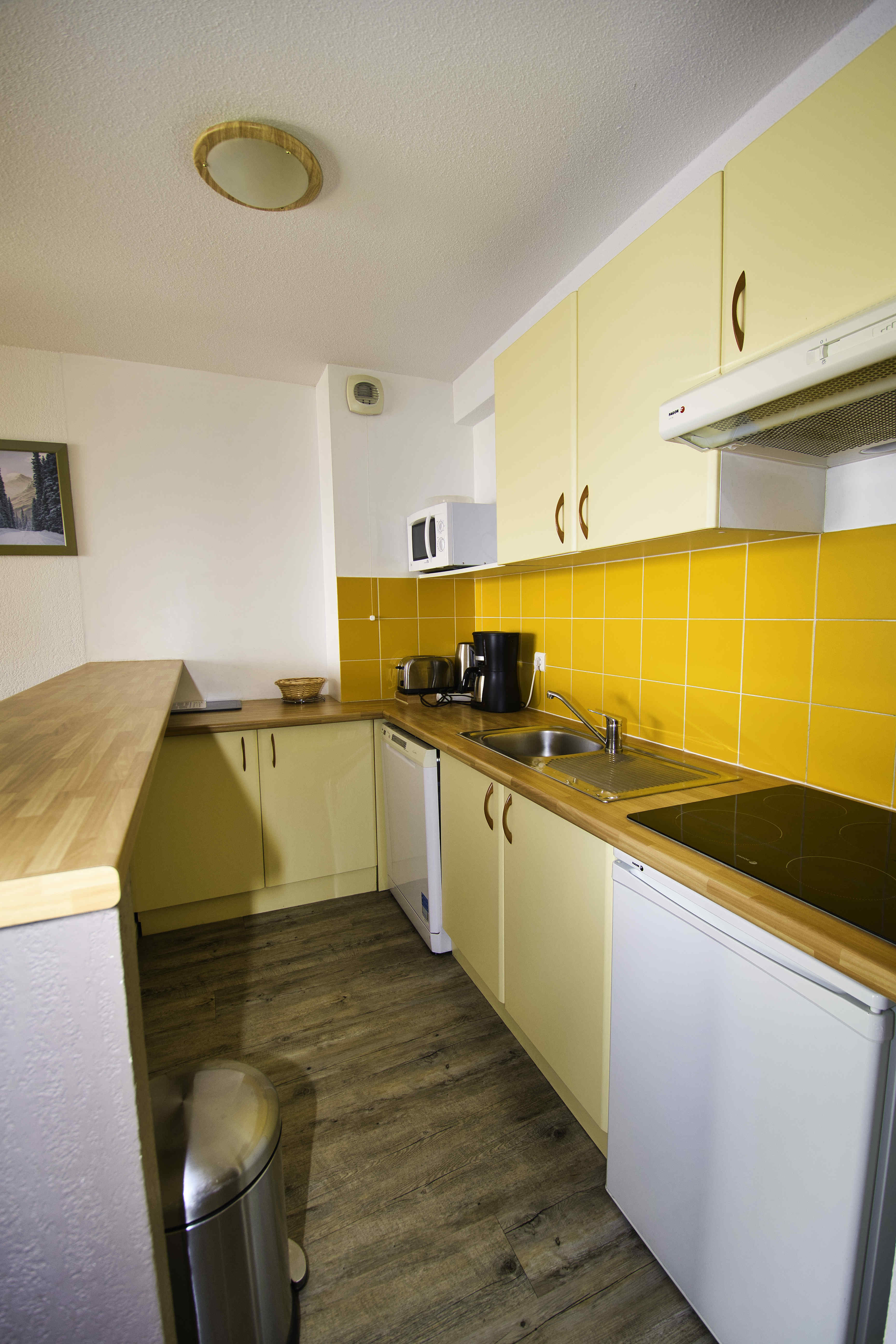 • Kitchenette de 4,27 m² ouverte sur le séjour, équipée d’une plaque vitrocéramique 4 feux, d’une hotte aspirante, de meubles hauts et meubles bas, d'un lave-vaisselle, d'un combiné four/micro-ondes, grille pain, cafetière à filtre intégré, bouilloire, autocuiseur, appareil à raclette, ustensiles de cuisine, assiettes, couverts...